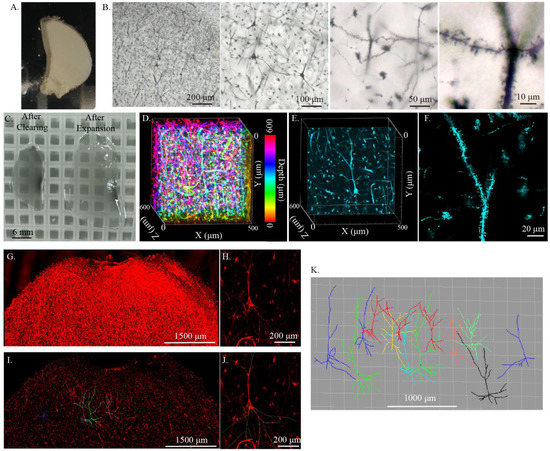 - Kassem, M.S.; Fok, S.Y.Y.; Smith, K.L.; Kuligowski, M.; Balleine, B.W. A novel, modernized Golgi-Cox stain optimized for CLARITY cleared tissue. J. Neurosci. Methods 2018, 294, 102–110. [Google Scholar] [CrossRef] [PubMed]