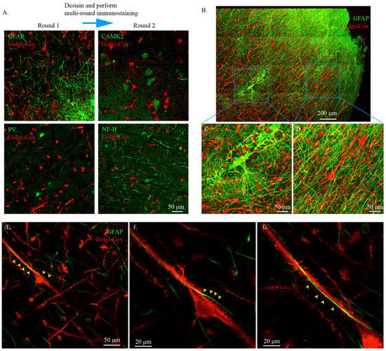 Immunostaining of cleared Golgi-Cox-stained human brain tissue. (A) Multi-round immunostaining of cleared Golgi-Cox-stained human brain tissue. The tissues were immunostained with GFAP and PV. After imaging, destaining was performed and the tissues were used repeatedly. CAMK2 and NF-H were stained in the next immunostain round. The Golgi-Cox-stained signal was obtained using the confocal reflective mode of the confocal microscopy, and the immunostained signal was obtained using the standard confocal imaging mode. (B) Three-dimensional immunostaining of cleared Golgi-Cox-stained tissue with GFAP. The Golgi-Cox-stained signal was obtained using the confocal reflective mode of the confocal microscopy, and the immunostained signal was obtained using the standard confocal imaging mode. (C) Zoomed-in image from the insert in (B) showing the fine morphology of astrocyte labeled using the immunostain. (D) Zoomed-in image from the insert in (B) showing the fine morphology of neurons labeled using the Golgi-Cox stain. (E) High-resolution imaging of neuron–neuron and neuron–astrocyte connections in the human brain. The yellow arrows indicate a neuronal cell body in close contact with other neuron fibers and the process of astrocytes closely surrounding the neuron fibers. The Golgi-Cox-stained signal was obtained using the confocal reflective mode of the confocal microscopy and the immunostained signal was obtained using the standard confocal imaging mode. (F,G) Zoomed-in images from (E) showing the process of astrocytes closely surrounding the fiber of the neuron.