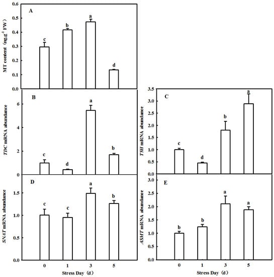 The variation of endogenous MT (A) and mRNA expression of TDC (B), T5H (C), SNAT (D), and ASMT (E) in leaves of cucumber plants under darkness. The two-leaf stage cucumber seedlings were treated with dark condition (day/night temperature: 25 °C/18 °C). The 2nd leaf samples were taken at 0, 1, 3, and 5 days. All values shown are mean ± SD (n = 3). a–d indicate that mean values are significantly different among samples (p < 0.05).