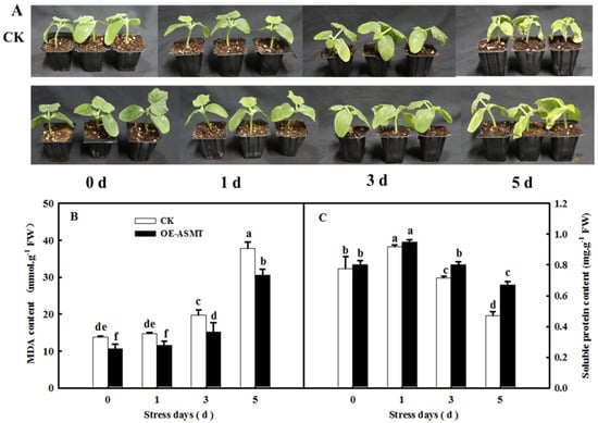 The effect of CsASMT transient overexpression on senescence of leaves under dark condition. (A) The phenotype of cotyledons; (B) MDA content; (C) soluble protein content. The CsASMT transient overexpression plants with two cotyledons were displaced into growth chambers and treated with dark condition (day/night temperature: 25 °C/18 °C). The cotyledons were collected for the determination of MDA and soluble protein contents at 0, 1, 3, and 5 days. All values shown are mean ± SD (n = 3). a–f indicate that mean values are significantly different among samples (p < 0.05).