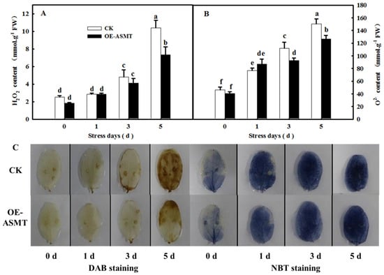 As shown in Figure 3A, the H2O2 and O2− contents of cucumber cotyledons in control and CsASMT overexpression plants increased gradually (Figure 3A,B), and after 5 days of darkness, the contents of H2O2 and O2− in leaves of overexpressed CsASMT plants were significantly lower than those of the control, decreasing by 29.5% and 15.7%, respectively. In accordance with the change in ROS content, the diaminobenzidine (DAB) and nitroblue tetrazolium (NBT) staining (Figure 3C) results confirmed that ROS increased significantly in both treatments and that ROS content was higher than that in CsASMT-overexpressing plants under darkness.