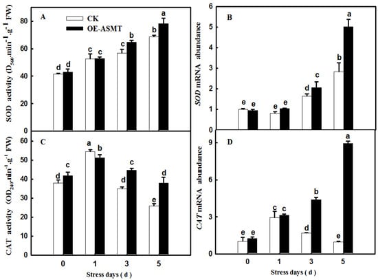 The effect of CsASMT transient overexpression on the activities and relative mRNA expressions of antioxidant enzyme in cucumber leaves under dark condition. (A) SOD activity; (B) the relative expression of SOD; (C) CAT activity; (D) the relative expression of CAT. The CsASMT transient overexpression plants with two cotyledons were displaced into growth chambers and treated with dark condition (day/night temperature: 25 °C/18 °C). The cotyledons were collected for the determination of antioxidant enzyme activity and related mRNA at 0, 1, 3, and 5 days. All values shown are mean ± SD (n = 3). a–e indicate that mean values are significantly different among samples (p < 0.05).