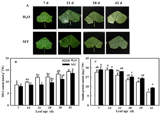To further verify whether the application of MT could be used during cucumber production, we observed the leaf phenotype and measured the change in MDA and soluble protein contents in leaves of different ages. As shown in Figure 5, the leaves of cucumber were obviously yellow-green, showed obvious signs of senescence at 42 days of age, and showed a significant increase in MDA content and a decrease in soluble protein content. However, the application of MT notably showed more green leaves, lower MDA content, and higher protein contents compared with the H2O treatment. For instance, the soluble protein content was 31.4% higher than that of the control at 42 days of leaf age.