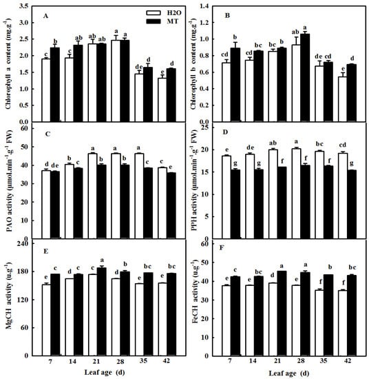 The effect of exogenous MT on chlorophyll metabolism in different age leaves of cucumber plants in a solar greenhouse. (A) Chlorophyll a content; (B) chlorophyll b content; (C) PAO activity; (D) PPH activity; (E) MgCH activity; (F) FeCH activity. At the three-leaf stage, the new leaf at the top was labeled 0 days and then labeled at 7, 14, 21, 28, 35, and 42 days. Meanwhile, cucumber plants were sprayed with 100 μmol·L−1 MT every 7 days, and plants treated with H2O were the control. The different leaf-age leaves were sampled for the determination of chlorophyll contents and relative enzyme activities. All values shown are mean ± SD (n = 3). a–g indicate that mean values are significantly different among samples (p < 0.05).