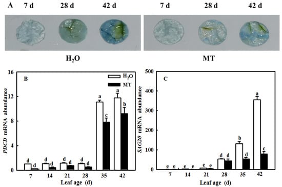 The effect of exogenous MT on cell-death- and senescence-related gene mRNA abundance in different age leaves of cucumber plants in a solar greenhouse. (A) The stain of programmed cell death; (B) PDCD mRNA abundance; (C) SAG20 mRNA abundance. At the three-leaf stage, the new leaf at the top was labeled 0 days and then labeled at 7, 14, 21, 28, 35, and 42 days. Meanwhile, cucumber plants were sprayed with 100 μmol·L−1 MT every 7 days, and plants treated with H2O were the control. The different leaf-age leaves were sampled for trypan blue staining and gene mRNA abundance determination. All values shown are mean ± SD (n = 3). a–e indicate that mean values are significantly different among samples (p < 0.05).