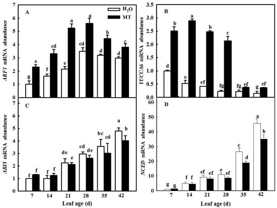 The effect of exogenous MT on IAA-/ABA-related gene mRNA abundance in different age leaves of cucumber plants in a solar greenhouse. (A) ARF1 mRNA abundance; (B) YUCCA6 mRNA abundance; (C) ABI5 mRNA abundance; (D) NCED mRNA abundance. At the three-leaf stage, the new leaf at the top was labeled 0 days and then labeled at 7, 14, 21, 28, 35, and 42 days. Meanwhile, cucumber plants were sprayed with 100 μmol L−1 MT every 7 days, and plants treated with H2O were the control. The different leaf-age leaves were sampled for gene mRNA abundance determination. All values shown are mean ± SD (n = 3). a–g indicate that mean values are significantly different among samples (p < 0.05).