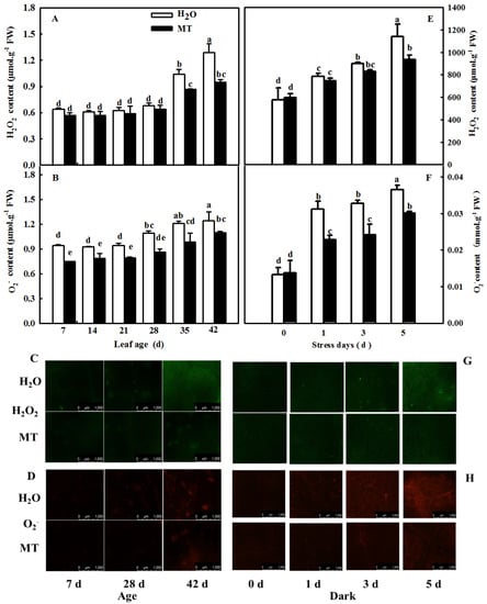 Through the measurement of the H2O2 content and O2− production rate in leaves during natural senescence within 42 days or in leaves in which senescence was induced by darkness, it can be seen that the contents of H2O2 and the O2− production rate in leaves gradually increased during senescence induced by age or darkness, but the application of exogenous MT significantly inhibited the accumulation of ROS in both experiments compared with the H2O treatment (Figure 9).