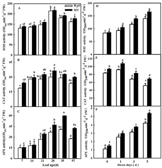 The effect of exogenous MT on antioxidant enzyme activity in senescent leaves of cucumber plants induced by age or darkness. (A–C) SOD, CAT, and APX activities in different age leaves; (D–F) SOD, CAT, and APX activities in leaves under darkness. At the two-leaf stage, the cucumber seedlings were planted in a solar greenhouse or started to be treated with MT. At the three-leaf stage, the new leaf at the top of cucumber plants was labeled 0 days and then labeled at 7, 14, 21, 28, 35, and 42 days in a solar greenhouse; plants were sprayed with 100 μmol·L−1 MT every 7 days, and plants treated with H2O were the control. Meanwhile, the seedlings were treated with H2O and 100 μmol·L−1 MT, respectively, 2 times, and then seedlings were displaced into growth chambers and treated with dark condition (day/night temperature: 25 °C/18 °C). The 2nd leaf samples were taken at 0, 1, 3, and 5 days. All values shown are mean ± SD (n = 3). a–g indicate that mean values are significantly different among samples (p < 0.05).