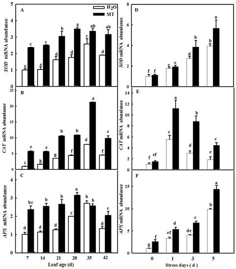 The effect of exogenous MT on the mRNA abundance of antioxidant enzyme genes in senescent leaves of cucumber plants induced by age or darkness. (A–C) SOD, CAT, and APX mRNA abundance in different age leaves; (D–F) SOD, CAT, and APX mRNA abundance in leaves under darkness. At the two-leaf stage, the cucumber seedlings were planted in a solar greenhouse or started to be treated with MT. At the three-leaf stage, the new leaf at the top of cucumber plants was labeled 0 days and then labeled at 7, 14, 21, 28, 35, and 42 days in a solar greenhouse; plants were sprayed with 100 μmol·L−1 MT every 7 days, and plants treated with H2O were the control. Meanwhile, the seedlings were treated with H2O and 100 μmol·L−1 MT, respectively, 2 times, and then seedlings were displaced into growth chambers and treated with dark condition (day/night temperature: 25 °C/18 °C). The 2nd leaf samples were taken at 0, 1, 3, and 5 days. All values shown are mean ± SD (n = 3). a–i indicate that mean values are significantly different among samples (p < 0.05).