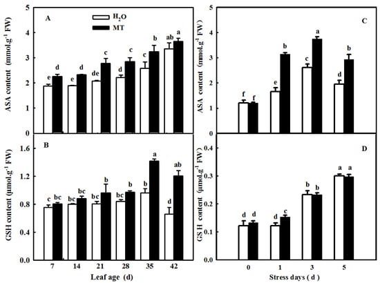 The effect of exogenous MT on the ASA and GSH contents in senescent leaves of cucumber plants induced by age or darkness. (A,B) ASA and GSH contents in different age leaves; (C,D) ASA and GSH contents in leaves under darkness. At the two-leaf stage, the cucumber seedlings were planted in a solar greenhouse or started to be treated with MT. At the three-leaf stage, the new leaf at the top of cucumber plants was labeled 0 days and then labeled at 7, 14, 21, 28, 35, and 42 days in a solar greenhouse; plants were sprayed with 100 μmol·L−1 MT every 7 days, and plants treated with H2O were the control. Meanwhile, the seedlings were treated with H2O and 100 μmol·L−1 MT, respectively, 2 times, and then seedlings were displaced into growth chambers and treated with dark condition (day/night temperature: 25 °C/18 °C). The 2nd leaf samples were taken at 0, 1, 3, and 5 days. All values shown are mean ± SD (n = 3). a–f indicate that mean values are significantly different among samples (p < 0.05).