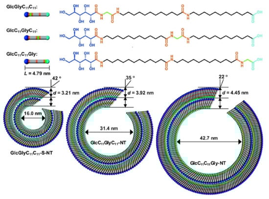 - Kameta, N.; Ding, W.; Masuda, M. Effect of glycine position on the inner diameter of supramolecular nanotubes consisting of Glycolipid monolayer membranes. Bull. Chem. Soc. Jpn. 2021, 94, 1172–1178. [Google Scholar] [CrossRef]