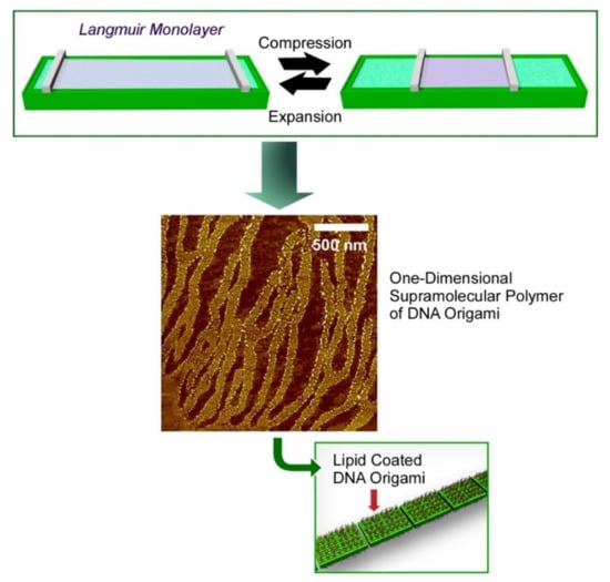 - Yonamine, Y.; Cervantes-Salguero, K.; Minami, K.; Kawamat, I.; Nakanishi, W.; Hill, J.P.; Murata, S.; Ariga, K. Supramolecular 1-D polymerization of DNA origami through a dynamic process at the 2-dimensionally confined air–water interface. Phys. Chem. Chem. Phys. 2016, 18, 12576–12581. [Google Scholar] [CrossRef]