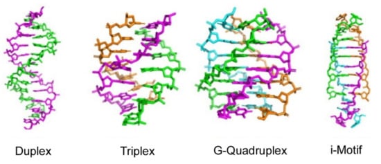 - Bochman, M.; Paeschke, K.; Zakian, V. DNA secondary structures: Stability and function of G-quadruplex structures. Nat. Rev. Genet. 2012, 13, 770–780. [Google Scholar] [CrossRef]