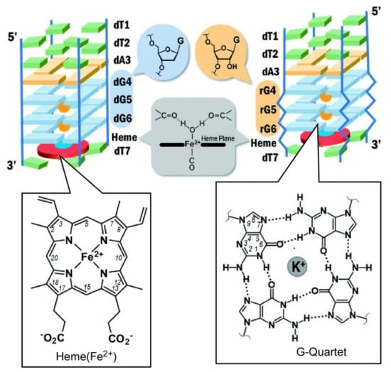 - Hayasaka, K.; Shibata, T.; Sugahara, A.; Momotake, A.; Matsui, T.; Neya, S.; Ishizuka, T.; Xu, Y.; Yamamoto, Y. Characterization of structure and catalytic Activity of a complex between heme and an all parallel-stranded tetrameric G-quadruplex formed from DNA/RNA chimera sequence d(TTA)r(GGG)dT. Bull. Chem. Soc. Jpn. 2020, 93, 621–629. [Google Scholar] [CrossRef]