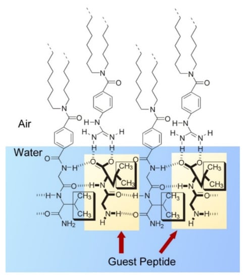 - Ariga, K.; Kamino, A.; Cha, X.; Kunitake, T. Multisite recognition of aqueous dipeptides by oligoglycine arrays mixed with guanidinium and other receptor units at the air−water interface. Langmuir 1999, 15, 3875–3885. [Google Scholar] [CrossRef]