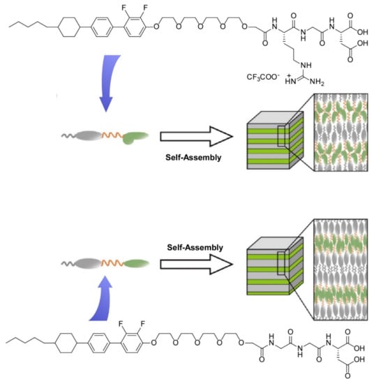- Eimura, H.; Niwa, A.; Uchida, J.; Kato, T. Self-assembly of peptide-containing mesogens: Thermotropic liquid-crystalline properties and macroscopic alignment of amphiphilic bioconjugates. Bull. Chem. Soc. Jpn. 2021, 94, 1588–1593. [Google Scholar] [CrossRef]