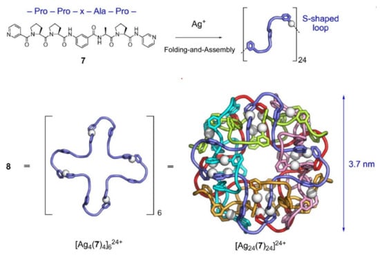 - Sawada, T.; Fujita, M. Orderly entangled nanostructures of metal peptide strands. Bull. Chem. Soc. Jpn. 2021, 94, 2342–2350. [Google Scholar] [CrossRef]