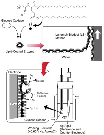 - Okahata, Y.; Tsuruta, T.; Ijiro, K.; Ariga, K. Preparations of Langmuir-Blodgett films of enzyme-lipid complexes: A glucose sensor membrane. Thin Solid Films 1989, 180, 65–72. [Google Scholar] [CrossRef]