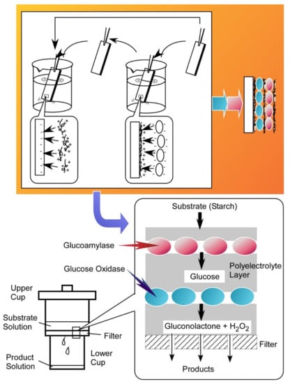 - Onda, M.; Lvov, Y.; Ariga, K.; Kunitake, T. Sequential actions of glucose oxidase and peroxidase in molecular films assembled by layer-by-layer alternate adsorption. Biotechnol. Bioeng. 1996, 51, 163–167. [Google Scholar] [CrossRef]