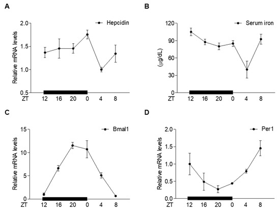 Hepcidin is an antimicrobial peptide hormone that plays an important role in iron homeostasis [5,6]. It is synthesized and secreted by the liver and binds to the iron exporter ferroportin (FPN) which is present on the membrane of enterocytes, macrophages, and hepatocytes. By binding to FPN, hepcidin inhibits cellular iron export by inducing its internalization and degradation [7]. Transcription of the hepcidin gene is regulated by two main stimuli, inflammation and plasma iron concentration [8,9]. Inflammatory signals, such as interleukin-6 (IL-6), activate the Janus kinase/signal transducer and activator of the transcription 3 signaling pathway, resulting in hepcidin induction [10]. IL-6-induced hepcidin inhibits the absorption of dietary iron, resulting in hypoferremia, which regulates pathogen survival [11]. The response of hepcidin to cellular iron levels is regulated by bone morphogenetic protein 6 (BMP6)/SMAD signaling [12]. BMP6 binds to BMP type I and type II serine/threonine kinase receptors and induces phosphorylation of SMAD proteins (SMAD1, SMAD5, and SMAD8) [13]. These findings suggest a critical role of hepcidin in iron metabolism. However, the circadian regulation of hepcidin and iron homeostasis remains unknown.