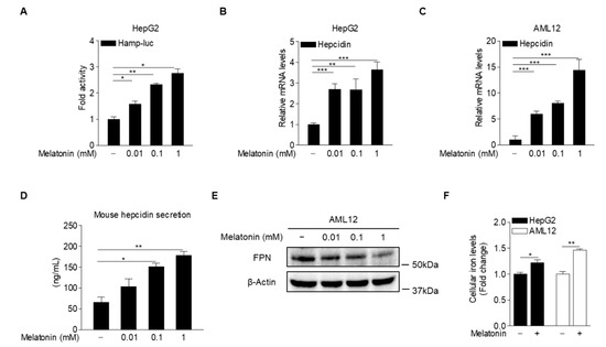 Melatonin upregulates hepcidin production in hepatocytes. (A) Effect of melatonin on hepcidin-promoter activity. HepG2 cells were transfected with a hepcidin-promoter reporter (mHamp-luc; 200 ng) and then treated with melatonin for 12 h after 2 h of serum starvation. (B,C) Quantitative polymerase chain reaction (qPCR) analysis showing hepcidin mRNA expression in (B) HepG2 cells and (C) AML12 cells. The cells were treated with melatonin for 6 h after 2 h of serum starvation. (D) Melatonin-induced hepcidin secretion. (E) Western blot analysis of FPN expression. AML12 cells were treated with melatonin for 6 h after 2 h of serum starvation. (F) Cellular iron concentration in HepG2 and AML12 cells treated with melatonin (100 µM) for 6 h after 2 h of serum starvation. Gels for Western blot analysis were run under the same experimental conditions. All experiments were performed in triplicate and repeated at least three times. Data are presented as means ± SD. * p < 0.05, ** p < 0.01, *** p < 0.001 using two-tailed Student’s t-test.