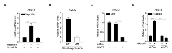 To elucidate the molecular mechanism underlying melatonin-dependent hepcidin expression, we investigated whether luzindole, a MT antagonist, inhibits melatonin-induced hepcidin expression in hepatocytes. The results showed that luzindole treatment almost completely inhibited the melatonin-induced increase in hepcidin mRNA levels (Figure 3A), implying that melatonin upregulates hepcidin expression by activating MT signaling. Interestingly, we found that basal MT1 expression levels were higher than MT2 expression levels in hepatocytes (Figure 3B). To demonstrate the role of MT1 in the melatonin-mediated increase in hepcidin expression in hepatocytes, AML12 cells transfected with a small-interfering RNA (siRNA) for MT1 (si-MT1) were treated with melatonin. As expected, melatonin-induced hepcidin expression was significantly blocked by transfection with si-MT1 (Figure 3C,D). These results demonstrated that melatonin regulates hepcidin expression by activating MT1 signaling in hepatocytes.