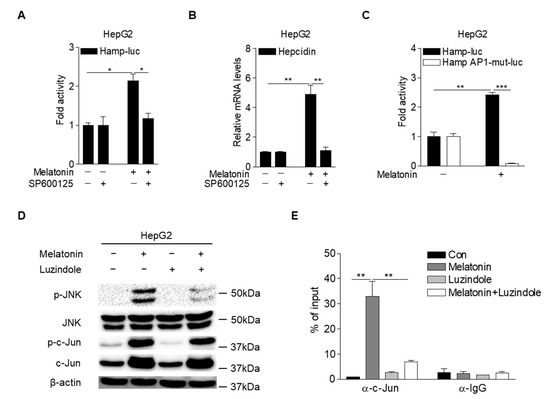 Lipopolysaccharide induced hepcidin expression by activating JNK-c-Jun signaling in hepatocytes [32]. To investigate whether JNK is involved in melatonin-induced hepcidin expression, we analyzed hepcidin-promoter activity and mRNA expression in HepG2 cells treated with melatonin and SP600125, a specific JNK inhibitor. The results showed that melatonin-induced hepcidin-promoter activity and mRNA expression were significantly reduced upon treatment with SP600125 (Figure 4A,B). It was reported that JNK-mediated phosphorylation of c-Jun increases AP-1 binding to target gene promoters [33]. Melatonin significantly increased hepcidin-promoter activity in HepG2 cells, which was almost completely blocked by the mutation of the AP-1-binding site in the hepcidin promoter (Figure 4C). Melatonin-mediated phosphorylation of JNK and c-Jun was significantly decreased in HepG2 cells treated with luzindole (Figure 4D). Furthermore, a chromatin immunoprecipitation (ChIP) assay demonstrated that melatonin increased c-Jun binding to the hepcidin promoter, which was significantly blocked by luzindole treatment (Figure 4E). These results suggest that melatonin induces hepcidin expression by activating the JNK-c-Jun pathway in hepatocytes.