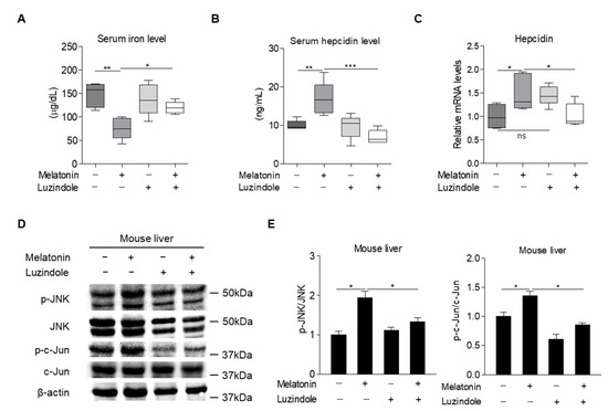 Effects of melatonin on hepcidin expression and iron metabolism in mice. (A–E) C57BL/6J mice were intraperitoneally injected with melatonin (10 mg/kg, n = 5) and luzindole (10 mg/kg, n = 5) for 12 h and then the following were analyzed: (A) Serum iron levels; (B) serum hepcidin levels; (C) hepcidin mRNA expression in the liver; and (D) Western blot analysis. (E) Graphical representation showing JNK and c-Jun protein levels. Gels for Western blot analysis were run under the same experimental conditions. All experiments were performed in triplicate and repeated at least three times. Data are presented as means ± SEM. * p < 0.05, ** p < 0.01, *** p < 0.001 using two-tailed Student’s t-test.