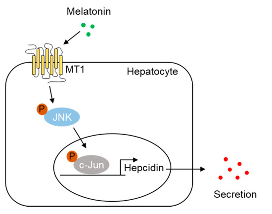 In conclusion, we report a previously unrecognized role of melatonin in the circadian regulation of hepcidin expression and iron metabolism, with detailed molecular mechanisms in hepatocytes. Melatonin induced hepatic hepcidin production by enhancing MT1-mediated JNK-c-Jun activation. Thus, these findings suggest that melatonin plays a pivotal role in the circadian regulation of hepcidin and iron homeostasis as well as controlling pathogen invasion.