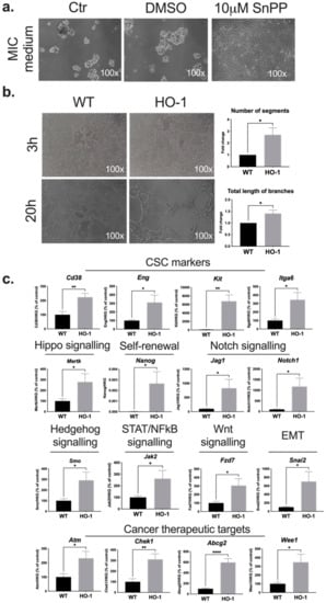 HO-1 is often overexpressed in cancer cells and induced by cancer therapies [28,29,30]. In this study, we used the B16-F10 murine melanoma cells engineered to stably overexpress HO-1 together with Luc transgene (Figure S1) or with GFP-Luc transgene [46]. Engineered control cells expressed reporter proteins only. The HO-1 overexpression was confirmed at mRNA, protein, and enzymatic activity levels (Figure S1). As in vitro research on CSC properties requires the usage of chemically defined serum-free media [47], we cultured B16-F10 cells in melanoma-initiating cell (MIC) medium [48]. After 7 days melanoma cells started to grow as non-adherent melanospheres (Figure 1a). Interestingly, when heme oxygenase inhibitor, tin protoporphyrin IX (SnPP), was added, we observed inhibition of non-adherent growth, indicating an important role of heme oxygenase activity in this CSC feature (Figure 1a).