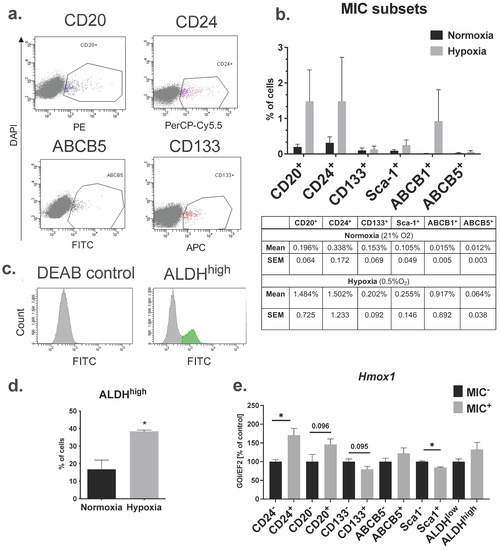 Frequency of cells expressing MIC markers in B16-F10 murine melanoma cell line. (a) Representative flow cytometry analysis (dot plots) of surface MIC markers. (b) Flow cytometry analysis of MIC surface markers of B16-F10 cells cultured 48 h in normoxia (21% O2) or hypoxia (0.5% O2) (n = 2–3, each bar represents mean + SEM). (c) Representative histograms of ALDHhigh cells detected with ALDEFLUOR kit. (d) Flow cytometry analysis of ALDHhigh cells cultured in normoxia or hypoxia (n = 3, each bar represents mean + SEM; * p < 0.05). (e) Expression of Hmox-1 mRNA levels in MIC subsets. qRT-PCR on 50 sorted cells after pre-amplification with the AmpliGrid system. GOI, gene of interest; Ef2 was used as a reference gene (each bar represents mean from 3–6 sorted samples + SEM; * p < 0.05).
