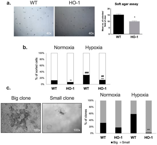 Effect of HO-1 overexpression on the clonogenic potential of B16-F10 melanoma cells. (a) Soft agar assay performed using WT and HO-1-overexpressing cells. Microscopic view of melanoma spheres 7 days after seeding. Numbers of spheres were calculated by two independent scientists (n = 2, each bar represents mean + SEM; * p < 0.05). (b) Percentage of cells that formed stable clones 13 days after single-cell sorting (n = 239–624, Fisher exact test; ** p < 0.01, *** p < 0.001 versus WT cells; ## p < 0.01, ### p < 0.001 versus normoxia). (c) Size of clones formed by WT and HO-1 melanoma cells in normoxia and hypoxia, 13 days after single-cell sorting (n = 39–76, Fisher exact test; *** p < 0.001 versus WT cells).