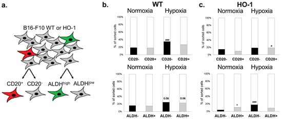 The same clonogenic test was performed for MIC fractions. For this purpose, we chose two MIC subsets: cells expressing surface antigen CD20 and cells displaying a functional marker—high ALDH activity (Figure 4a). The result showed tendencies similar to those observed for bulk cells, towards the increased clonogenicity in hypoxia and reduced clone formation by HO-1-overexpressing cells (Figure 4b,c). Importantly, neither expression of CD20 nor ALDH activity influenced the clonogenic potential of WT (Figure 4b) and HO-1 (Figure 4c) melanoma cell lines. Only HO-1 cells with high ALDH activity increased clone formation in normoxia when compared to HO-1 ALDHlow cells (Figure 4c), but this might be an indirect effect of a lower than normally observed clonogenicity of control cells. These results show that phenotypic or functional MIC markers in murine melanoma cell line do not identify cell fractions with increased clonogenic potential. Consistent with what was observed for bulk populations, HO-1 overexpression led to the formation of smaller clones in hypoxia, regardless of the MIC expression status (Figure S3).