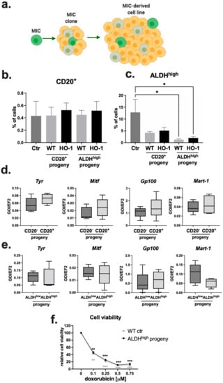 High activity of ALDH was previously described to be responsible for chemoresistance of different cancer cell types [54]. Therefore, we investigated if the progeny of ALDHhigh cells is more resistant to doxorubicin. Cytotoxicity of doxorubicin was strongly pronounced in this set of experiments, but we did not observe any differences in response to the treatment between ALDHhigh progeny-derived cell lines and control B16-F10 cells (Figure 5f). This result further confirms that the progeny of MIC+ cells reconstitute the features of the parental cell line.