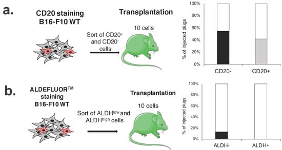 First, we performed in vivo transplantation of 10 sorted CD20− and CD20+ cells per plug (two plugs per mouse) to the C57BL/6 syngeneic immunocompetent mice (Figure 6a). We observed that both fractions showed high tumorigenic efficacy and there was no difference in the formation of tumors between CD20− and CD20+ cells (Figure 6a). Additionally, tumors formed by both CD20− and CD20+ fractions had similar metastatic potential and resulted in similar survival outcome of mice (Figure S5). These results confirm our in vitro observations where CD20− and CD20+ melanoma cells displayed similar clonogenicity after single-cell sorting (Figure 4b). We performed the same experiment using sorted ALDHlow and ALDHhigh cells. Interestingly, cells with high ALDH activity were unable to form any tumors (Figure 6b).