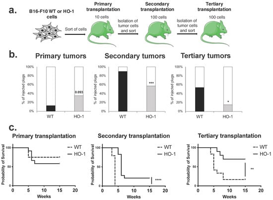 Our in vitro experiments suggested that HO-1 overexpression increases the expression of CSC-associated genes and some CSC features (Figure 1) but at the same time decreases the clonogenicity of B16-F10 melanoma cells (Figure 3). To ultimately verify the effect of HO-1 on melanoma tumorigenicity and self-renewal of the cells, we performed an in vivo serial transplantation assay, the gold standard in research on CSC tumorigenicity [55]. We sorted B16-F10 WT and HO-1 cells and injected 10 cells per plug to the primary recipients, namely to the GFP-expressing C57BL/6 transgenic immunocompetent mice (Figure 7a). After the formation of primary tumors, mice were sacrificed, tumors were digested, and 100 tumor-derived cells were injected into the secondary recipients. The same procedure was performed for the tertiary recipients (Figure 7a). The data showed that injection of B16-F10 WT melanoma cells resulted in the formation of tumors in 15% of injected plugs (Figure 7b). Overexpression of HO-1 increased the efficacy of primary tumor formation up to 35% (Figure 7b), which might be a result of improved melanoma cell survival [39]. Interestingly, when primary tumors were transplanted to the secondary recipients, up to 90% of transplanted plugs formed tumors in the WT group, but only 57% of transplanted plugs formed tumors in the HO-1 group. A similar relationship, with a lower tumor formation rate by HO-1-overexpressing cells, was found in tertiary transplantation (Figure 7b). As a consequence, we observed better survival of animals in secondary and tertiary recipients of HO-1 cells (Figure 7c). Finally, we did not observe any difference in the metastatic potential of WT and HO-1 cells (data not shown). Generally, these data indicate that overexpression of HO-1 decreases the self-renewal and tumorigenicity of melanoma cells in serial in vivo transplantation assay. This is in line with the decreased clonogenic potential of these cells observed in vitro.
