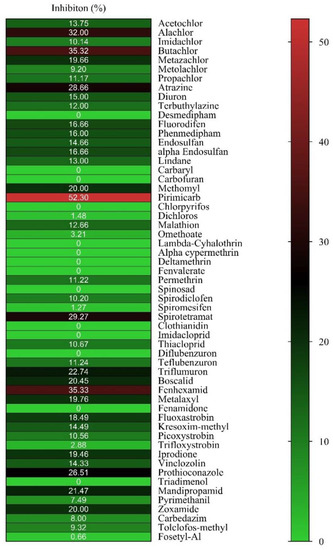 Screening of inhibition potency of pesticides (25 μM) towards hGSTM1-1. The isoenzyme was assayed in all measurements using CDNB-GSH assay system. The colors represent the mean values of three inhibition assays (%) for each pesticide against the tested enzyme with a variation less than 5% in all cases.