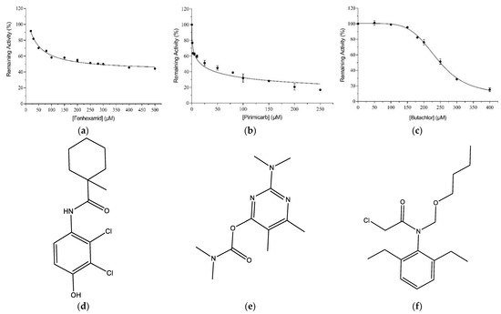 Concentration–response curve for fenhexamid (a), pirimicarb (b), and butachlor (c). IC50 for hGSTM1-1 was determined by fitting Equation (4) to the data through non-linear curve-fitting methods. The structures of fenhexamid, pirimicarb, and butachlor are shown in (d), (e) and (f), respectively.