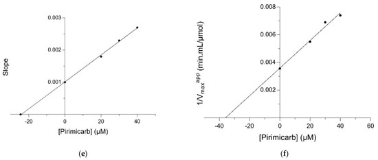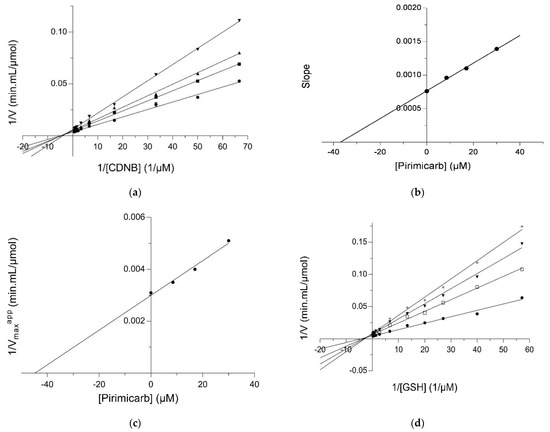 Kinetic inhibition study. (a): Lineweaver–Burk plot for the inhibition of hGSTM1-1 with pirimicarb at different CDNB concentrations. Pirimicarb concentrations: 0 μM, (●); 8.5 μM, (■); 17 μM, (▲); 30 μM, (▼); (b): Secondary (derivative) diagram. The data obtained from the Lineweaver–Burk diagram. The point of intersection with the x-axis corresponds to the Ki inhibitory constant; (c): Secondary (derivative) diagram. The data obtained from the Lineweaver–Burk diagram. The point of intersection with the x-axis corresponds to the Ki’ inhibitory constant; (d): Lineweaver–Burk plot for the inhibition of hGSTM1-1 by pirimicarb at different GSH concentrations. 0 μM, (●); 20 μM, (□); 30 μM, (▼); 40 μM, (†); (e): Secondary (derivative) diagram. The data were obtained from the Lineweaver–Burk diagram. The point of intersection with the x-axis corresponds to the Ki inhibitory constant; (f): Secondary (derivative) diagram. The data obtained from the Lineweaver–Burk diagram. The point of intersection with the x-axis corresponds to the Ki’ inhibitory constant.