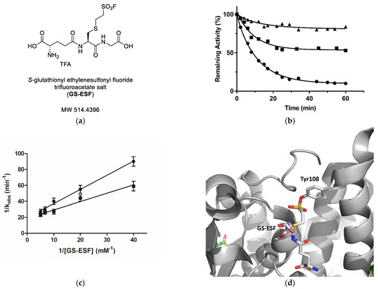 GS-ESF (Figure 4a) is a GST irreversible (covalent) inhibitor that inhibits the functions of several GSTs. GS-ESF is a GSH derivative, in which the -SH group was substituted by the electrophilic reactive group sulfonyl fluoride, allowing for the covalent reaction of GS-ESF with a nucleophile group of the H-site of GSTs. For example, GS-ESF specifically reacts with the H-site residue Tyr108 of GSTP1-1 [28].
