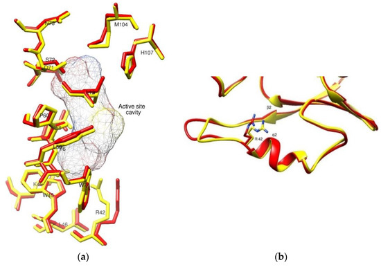 The structural alignment showed subtle changes among the active site residues in the low- and high-resolution hGSTM1 structures (Figure 5). The most noticeable difference was observed in Arg42, which is involved in the formation of a salt bridge with GSH and points closer to the active site cavity in the high-resolution hGSTM1 structure than in its low-resolution counterpart (Figure 5a). A small difference in the loop region connecting the β2 strand and the α2 helix is also present between the two structures. The Root-Mean-Square Deviation (RMSD) value for this region is 1.36 Å, which is higher than the RMSD value for the overall structure (0.65 Å). Furthermore, slight differences in the conformations of His107, Met104, and Ser72 were also observed (Figure 5b).