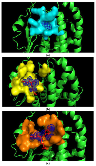 (a): The cavity volume of the ligand-free human GSTM1-1. (b): The cavity volume of the human GSTM1-1 in complex with GSH. (c): The cavity volume of the human GSTM1-1 in complex with GSH and CDNB. Figures have been created with KVFinder (PyMOL plug-in).