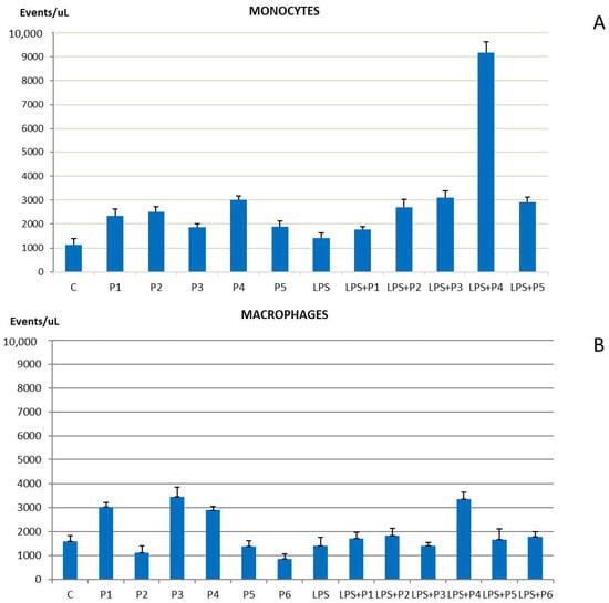 Innate immunity represents a finely controlled network of physiological processes that synchronize immunocompetent cells to control and patrol the integrity of organs when exposed to injuries that may alter their functions [1,2,3,4]. Leukocytes are a qualified group of immune cells that are mostly involved in recognizing foreign organisms and in developing proper phagocytic activities [5,6,7]. In particular, monocytes are circulating leukocytes that move to sites of infection attracted by cytokines and chemokines, a specialized set of molecules that cooperate to induce terminal differentiation of monocytes into macrophages with intense phagocytic activity [8,9,10,11]. These large phagocytes are found in all tissues [12], where they patrol for potential pathogens through amoeboid movement. Besides phagocytosis, they play a critical role in nonspecific defense (innate immunity) and help in activating adaptive immunity functions by recruiting other immune cells, such as lymphocytes, by presenting antigens to T cells. In humans, dysfunctional macrophages cause severe diseases, such as chronic granulomatous disease, which result in frequent infections [13].