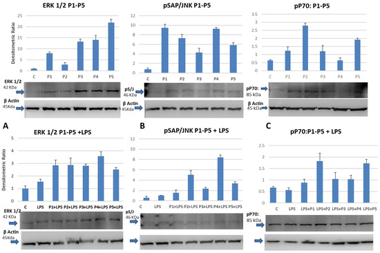 Induction of the mitogen-activated phosho-Erk1/2(4.(A)), SAP/JNK(4.(B)) and p70(4.(C)) (in established monocytes). P1, P2, P3, P4, P5 represent Epitalon, Vilon, Thymogen, Thymalin and Chonluten, respectively as indicated. Bar graphs show the mean values of three independent experiments.