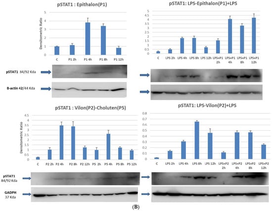 In order to better investigate the molecular mechanisms that could influence the anti-inflammatory abilities of bio-regulators, Western Blot analyses were conducted to evaluate the activation status of the signal transducers and activators of transcription, namely STATs. STATs are a series of cytoplasmic signaling molecules mainly involved in cytokine activation, proliferative induction signals and inflammatory response modulation. As shown in Figure 3B, the treatment of macrophages with the pro-inflammatory inducer LPS activates STAT1 phosphorylation on a time course manner with maximum induction between four and eight hours after treatment. Co-incubation with standard amounts of peptides determines an increase in the phosphorylation process with the same temporal pattern, suggesting that the peptides may cooperate within the same transduction axis, or through an independent mechanism. This experiment confirms that at least Epitalon (P1), Vilon (P2) and the bronchial peptide Chonluten (P5), activate STAT1 phosphorylation, functioning possibly via a receptor-independent mechanism, not involving IFN-α/IFN-R interactions, as documented by no effect on IFN-α production (Figure 3A). As a matter of fact, several evidences suggest that the chemical structure of such peptides allows direct penetration into the cellular compartment regulating gene expression [22].