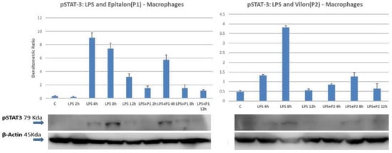 pSTAT3 activation upon LPS and LPS + bio-peptides. Densitometric analysis was performed normalizing band intensity to β-actin expression. Bar graphs show the mean values of three independent experiments.