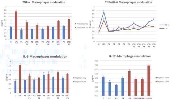 In order to study the pro-inflammatory cytokines releasing capacity of LPS activated macrophage cells while absence or while presence of peptides, we performed a flow cytometric analysis to detecting most of the pro-inflammatory and anti-inflammatory cytokine molecules. Despite some cytokines not being detected because of the limit of quantification (LOQ) due to sensitivity, it was shown that TNF-α, IL-6, and IL-17 at least, were reduced on cells co-incubated with peptides and LPS (Figure 5). IL-6 and TNF releases were almost downregulated by all the peptides in LPS media, whereas Thymogen (P3) was the most effective peptide attenuating IL-17 release from activated macrophages. Although we have not yet precisely identified the exact molecular mechanism that influences this inflammatory state, it is strikingly evident that the main pro-inflammatory signaling axis is modulated by the activity of peptides. This finding deserves a thorough investigation into probable peptide-induced gene regulation.