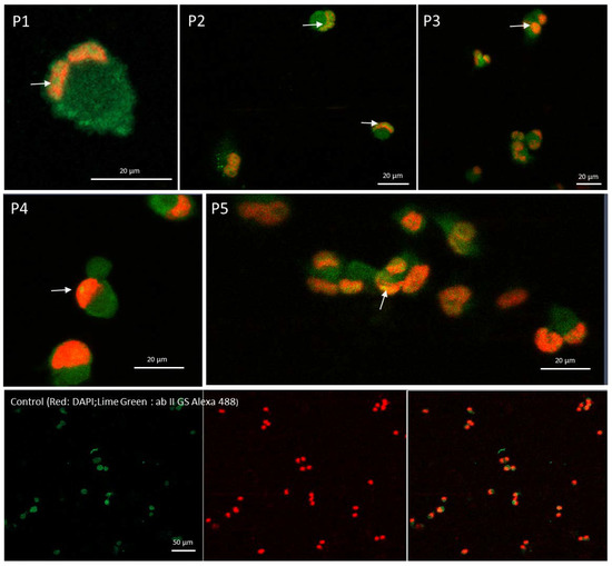 A clear shifting of the latent cytoplasmic STAT1 molecules into the nuclei of peptide-treated macrophages was observed through confocal microscopy. As evident in Figure 6, the control differentiated THP-1 cells did not show any significant transfer of the STAT1 into the nuclei. Whereas, upon peptide incubation, most of the peptides were able to activate cytoplasmic transducers passage into the nuclei as marked in Figure 6. The phosphorylation of the STAT1 molecules allows the unmasking of the nuclear localization site (NLS), determining the translocation into the cell nucleus. The conventional DAPI staining, that specifically binds strongly to adenine–thymine-rich regions in DNA, was used. Subtraction of the background staining was from incubation of fluorescence secondary specific antibody.