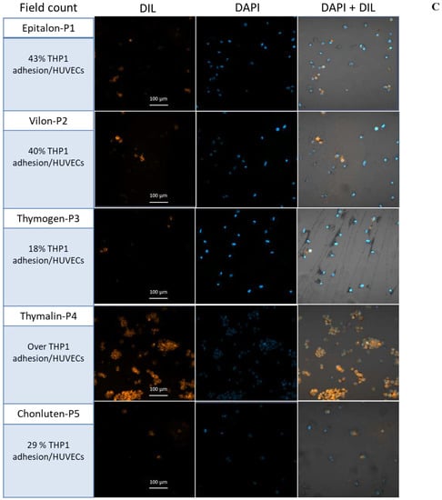 Human Umbilical Vein Endothelial Cells (HUVECs) were treated HUVEC with lipopolysaccharide (LPS) overnight to test adhesion molecule activation. ICAM-1 activation was determined using a Western Blot assay. The HUVECs were seeded on a specific photo-compatible multiple well plastic device and incubated with LPS for at least 12 h. Meanwhile, THP-1 monocytes were pretreated with specific bio-peptides for 8 h and labeled with DIL, before being transferred onto the monolayer of activated HUVEC cells for adhesion assay. Then, after removing the unbound cells, the monocytes adhering to the activated endothelial cells were quantified by counting the residual fluorescence and plotting the percentage of untreated monocytes adherent on the LPS-activated endothelial control cells versus the bio-peptide-treated monocytes. For each sample, ten fields were randomly selected at 20× optical zoom. For each field, all the nuclei stained with the DAPI and all the cells labeled with the DIL were counted. As can be seen in Figure 7A, the monocytes attached to the activated endothelial cells were recognized by the overlapping fluorescences (DAPI + DIL). As shown in Figure 7C, a significant decrease in the percentage of adherent monocytes occurred with respect to LPS-treated control HUVECs. All peptides were able to downregulate the adhesion mechanism of cell–cell interaction with the exception of Thymalin (P4) that conversely appeared to induce an increase in the interaction effect (Figure 7).