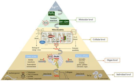 In short, at the molecular level, excessive iron in cells can generate a large number of reactive oxygen species (ROS) in the Fenton reaction, finally leading to aging. At the cellular level, mitochondrial iron levels change with aging, which in turn leads to mitochondrial dysfunction, causing further aging. Furthermore, at the organ level, iron concentration can increase in different areas and cell types of the brain, and various molecular forms of iron (ferritin, neuromelanin, transferrin, hemosiderin) can deposit in the brain, which together results in brain aging. Ultimately, at the individual level, model organisms such as S. cerevisiae, C. elegans, and D. melanogaster regulate the iron content of the body through different mechanisms, eventually leading to individual aging (Figure 2).